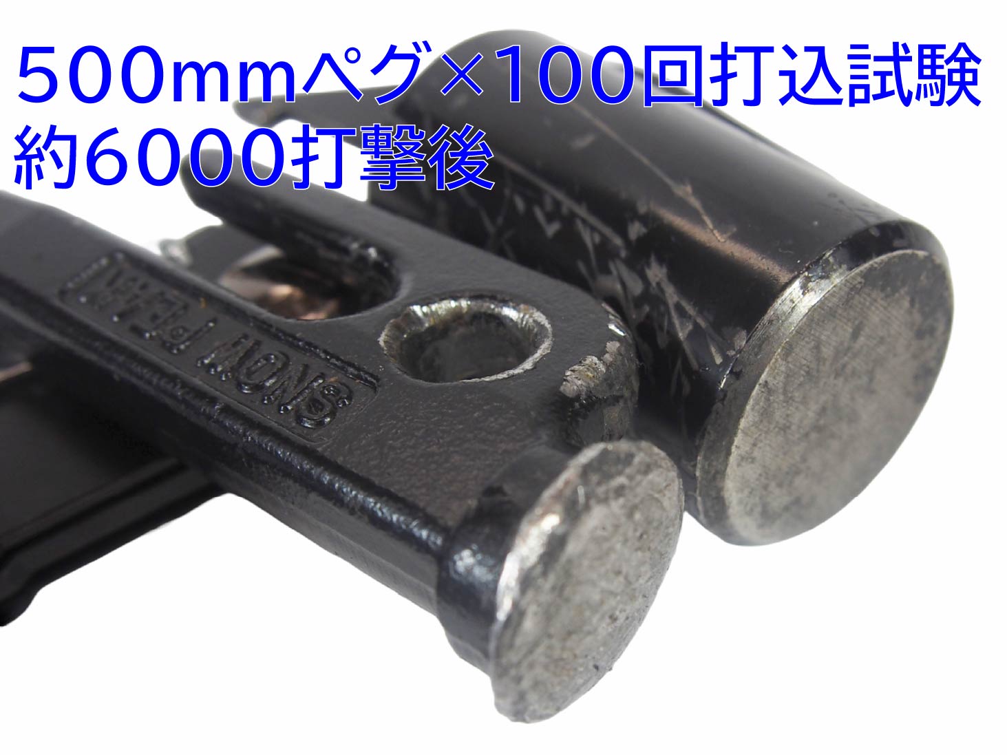 写真(下)は50cmペグ100回耐久試験(約6000打撃)後のハンマーとペグの実物写真となります(Pro Hammer Miniも同一材料・同一硬度となります)