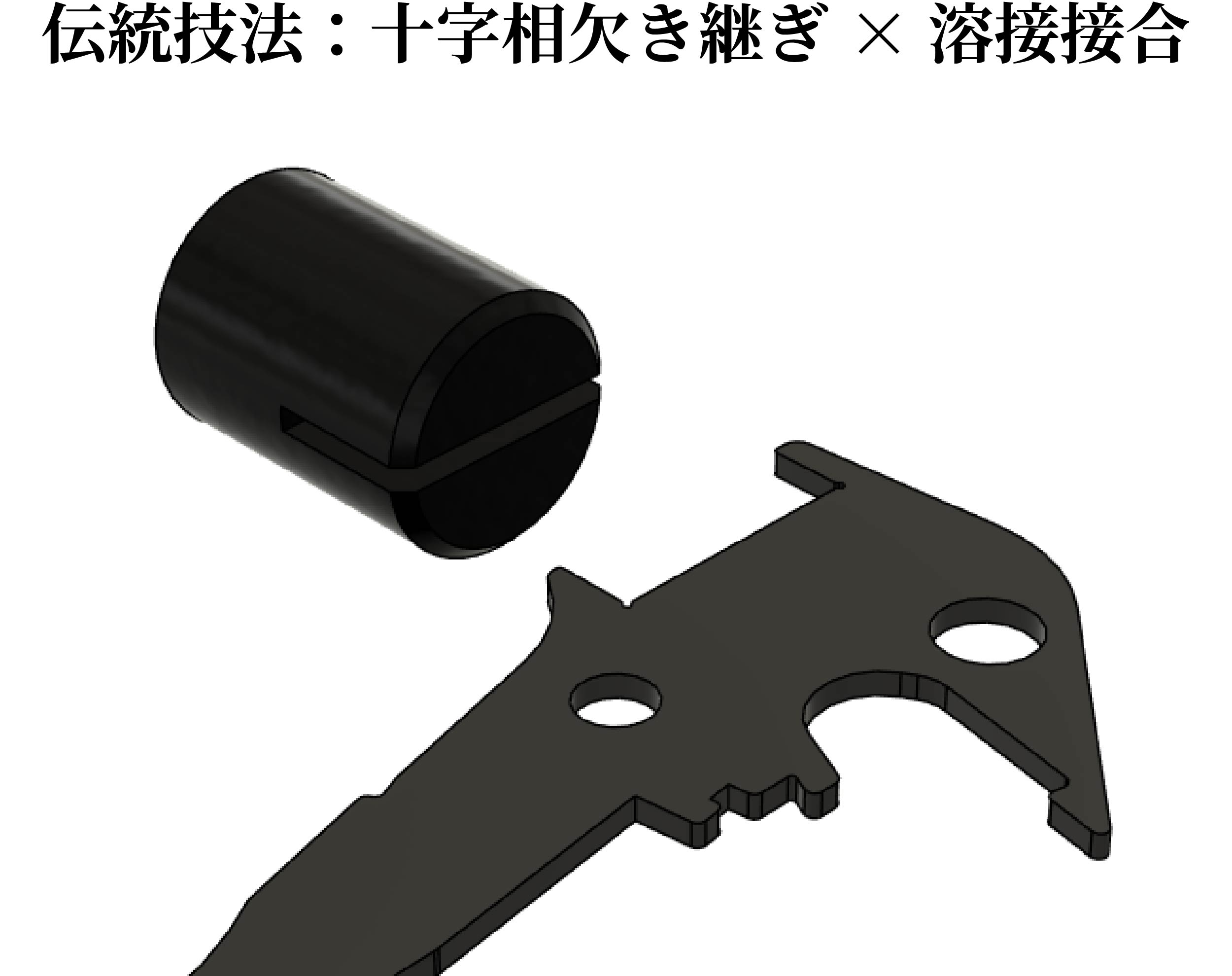 本ペグハンマーは木材の伝統的な継ぎ技法である『十字相欠き継ぎ』に『溶接接合』を加えた耐久性に優れた2pcs構造となっております。
